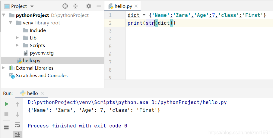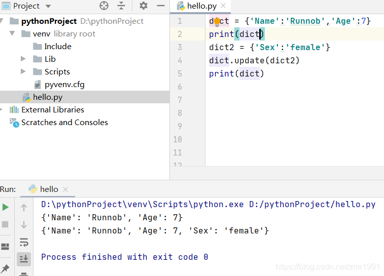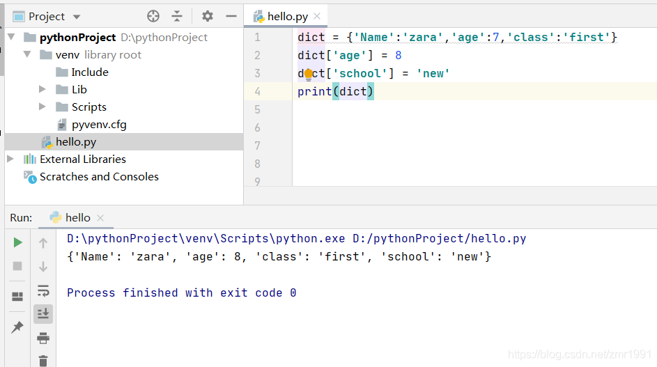 2: 사전의 각 키 값 key=>value 쌍에 콜론을 사용합니다: 분할, 각 키 값 쌍 사이에 쉼표를 사용합니다. 전체 사전을 괄호 {}에 포함합니다.