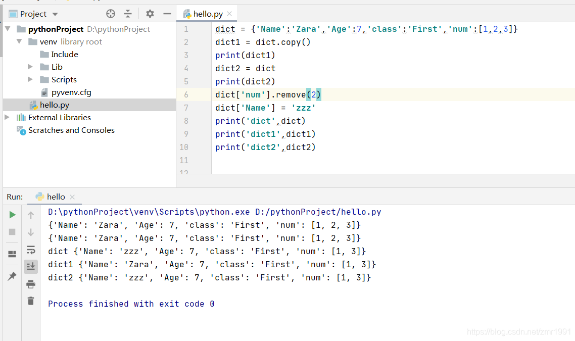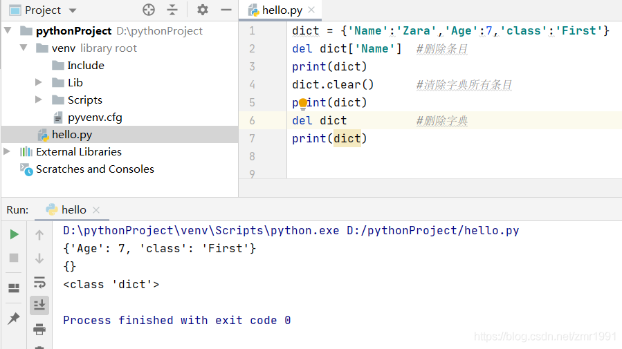 단일 요소를 삭제할 수 있고 사전을 비울 수 있으며 사전 삭제용 del 명령을 표시합니다