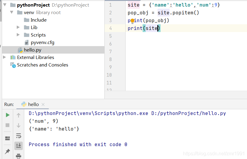 16: popitem(): 사전의 마지막 키와 값을 무작위로 반환하고 삭제합니다. 사전이 비어 있는데도 이 방법을 호출하면 KeyError 이상을 보고합니다.